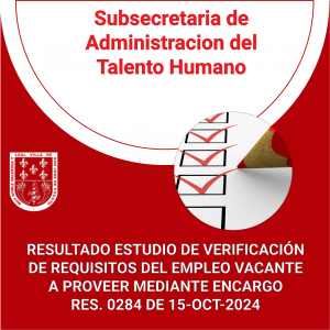 RESULTADO ESTUDIO DE VERIFICACIÓN DE REQUISITOS DEL EMPLEO VACANTE A PROVEER MEDIANTE ENCARGO/ RES. 0284 DE 15-OCT-2024 Dando cumplimiento a la Resolución 0284 de 15 de octubre de 2024 ” POR MEDIO DE LA CUAL SE ESTABLECE EL PROCEDIMIENTO PARA LA PROVISIÓN DE ENCARGOS EN VACANTES DEFINITIVAS 25/10/2024 11:03 am 0 comentarios Like0